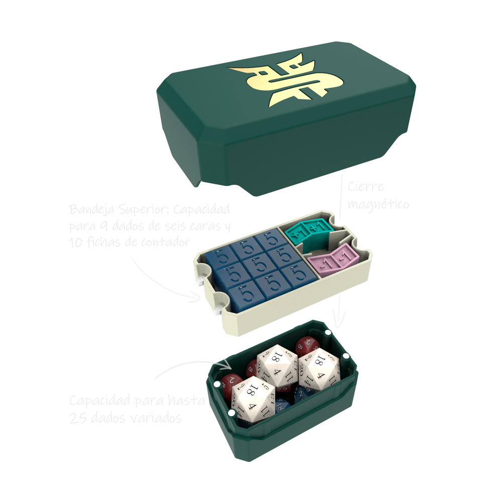 Espacio para 25 dados variados (de 12 caras, 20 caras, 6 caras, etc.) o 3 dados de 20 caras bundle y unos 8 dados normales más