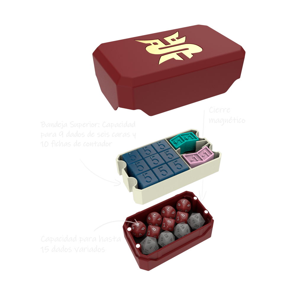 Bandeja Superior: Capacidad para 9 dados de 6 caras de 16mm y 7 fichas +1/+1 y 3 fichas -1/-1 (las fichas vienen incluidas con el producto).